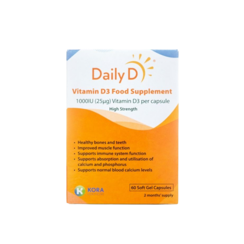 Introducing DailyD 1000iu Vitamin D3 Capsules â your trusted ally for optimal health. Each bottle contains 60 high-strength capsules designed specifically to fortify your bodyâs Vitamin D levels. With a recommended dosage that provides an adequate supply for two months, these capsules ensure you benefit from the essential properties of Vitamin D3.