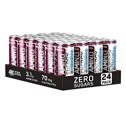Optimum Nutrition's ESSENTIAL AMIN.O. ENERGY + Electrolytes is specifically designed for those leading a fast-paced life. This top-selling sports nutrition drink is now available in a convenient 24-pack of 250 ml Mixed Berry cans, making it easier than ever to fuel your day. With no sugar and only 10 calories per serving, your body gets a refreshing and delicious energy boost without the guilt. Each can contains 3.1 g of essential amino acids sourced from nature, which supports muscle recovery and endurance. The added 100 mg of caffeine enhances your mental focus, making it an ideal companion for workouts or busy days. Enjoy invigorating flavors like Tropical, Orange, and Mixed Berry while rehydrating with 70 mg of electrolytes to replace whatâs lost in sweat.