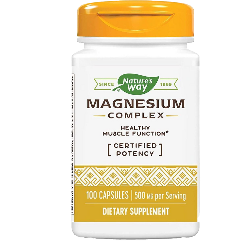 • Nature's Way Magnesium Complex 500mg combines the powerful benefits of magnesium to promote healthy muscle function. This essential mineral, found in various foods such as leafy greens and whole grains, plays a crucial role in numerous bodily processes. Each serving of our magnesium complex delivers an impressive 500 mg of magnesium, ensuring that your body receives the support it needs for optimal wellness.