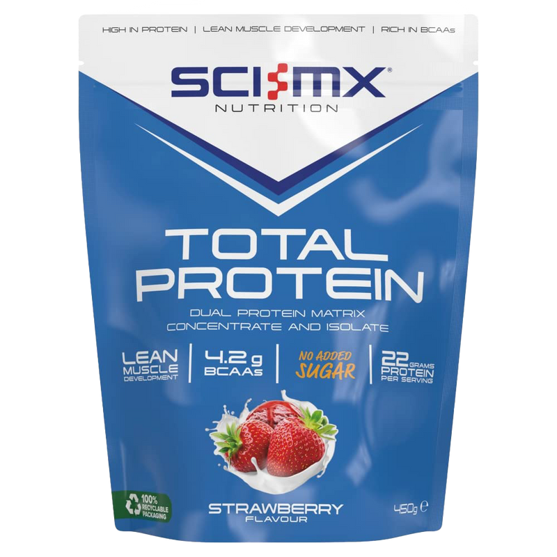 • Sci-MX Total Protein 450g Strawberry is designed to enhance your daily nutrition effortlessly. With 22g of protein per serving, this supplement supports muscle recovery and growth, making it a perfect companion for fitness enthusiasts and athletes alike.