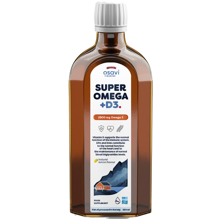 Osavi Super Omega + D3 2900 mg Omega 3 (Lemon) 250 ml is a premium food supplement crafted from high-quality fish oil sourced from wild pelagic fish, primarily anchovies, harvested through sustainable fishing practices. This liquid supplement is enriched with essential unsaturated fatty acids, including EPA (eicosapentaenoic acid) and DHA (docosahexaenoic acid), uniquely presented in a highly absorbable triglyceride (TG) form. Furthermore, it contains vitamin D3, specifically cholecalciferol, ensuring optimal bioavailability.