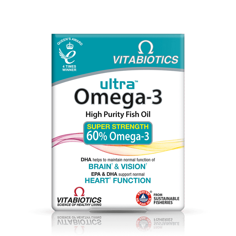 • Experience the countless health benefits of Vitabiotics Ultra Omega 3 High Purity Fish Oil capsules, specially formulated to support your body’s needs. Each serving is enriched with over 60% Omega-3 fatty acids, including vital components DHA and EPA, known for their significant role in promoting heart and brain health.