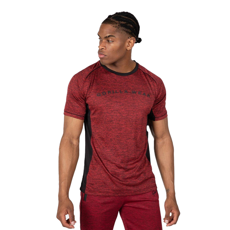 Introducing the Gorilla Wear Fremont T-Shirt in a striking Burgundy Red/Black colorwayâan essential addition to any athlete's wardrobe. Designed with the athlete in mind, this t-shirt combines smooth fabric with mixed colors and breathable mesh sides to deliver unparalleled ventilation during your most demanding workouts. Whether you're training hard or sparring in martial arts, this T-Shirt is lightweight, allowing for swift movements and quick-drying comfort.