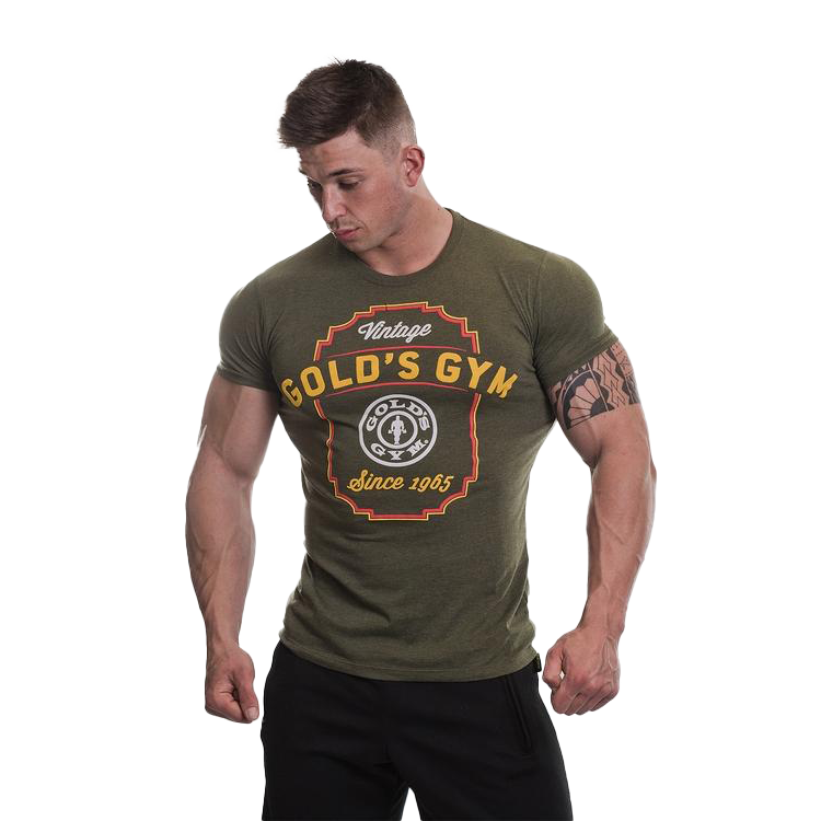 Gold's Gym Printed Vintage Style T-Shirt Army Marl combines style and function for the modern fitness enthusiast. This t-shirt is crafted from a high-quality fabric blend of 55% cotton and 45% polyester, ensuring a soft and breathable experience. Its stretch muscle-fit design is tailored to complement your physique and offer unrestricted movement, making it ideal for intense workouts or casual outings.
