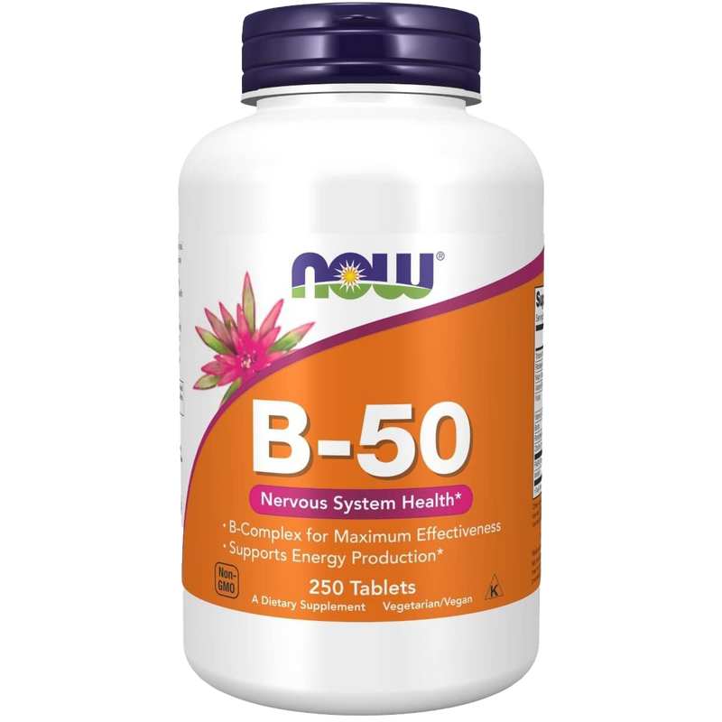 NOW Foods B-50 Tabs ensure you receive a balanced array of B-vitamins to support energy production, promote healthy homocysteine metabolism, and maintain overall nerve health. As water-soluble vitamins, they are vital for your body and must be replenished daily. Vitamin B-12, essential for vegetarians and those with limited animal product intake, is included to prevent deficiency.