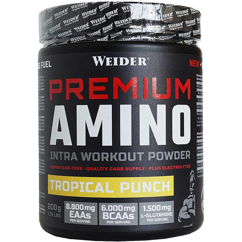 Introducing the Weider Premium Amino, Tropical Punch - 800 grams, the ultimate supplement tailored for fitness enthusiasts seeking to enhance their workout efficiency and recovery. This high-quality powder mixes seamlessly into a revitalizing drink loaded with essential amino acids, carbohydrates, and electrolytes, making it an ideal choice for supporting muscle growth and hydration.