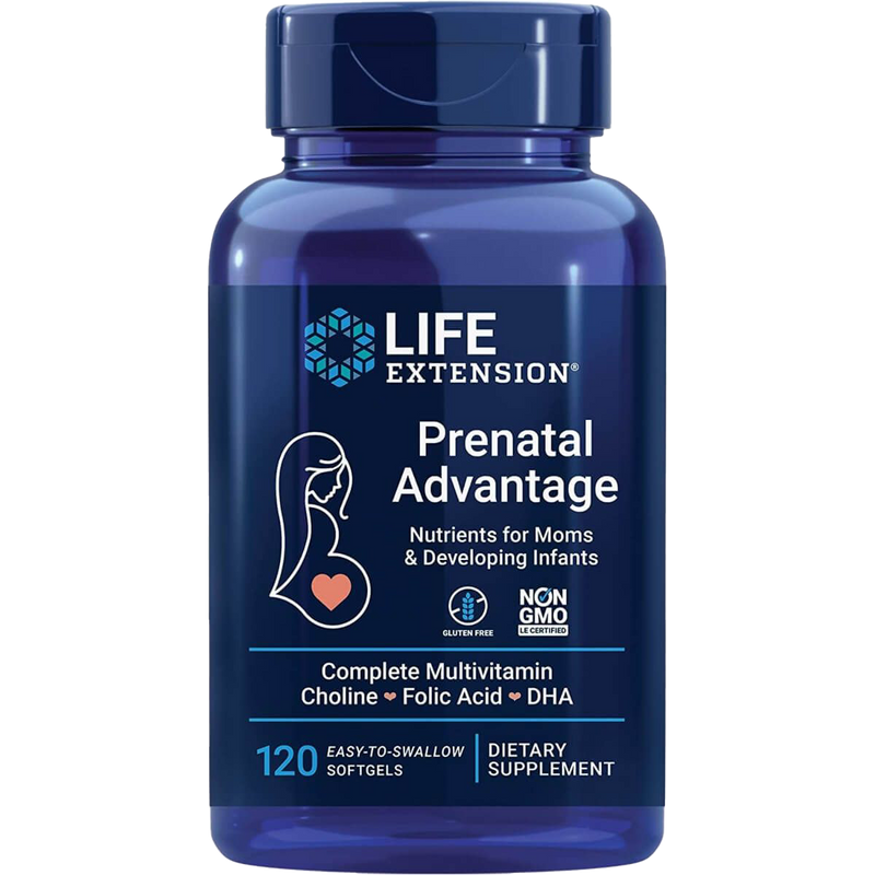 • The Life Extension Prenatal Advantage is a scientifically formulated supplement designed specifically for the needs of pregnant and nursing women. With a precise blend of essential vitamins and minerals, including 100% of the recommended daily value, this supplement ensures that you receive the necessary nutrients for your health and that of your baby. Enhanced with DHA omega-3, choline, lutein, and zeaxanthin, this product not only supports maternal wellness but also plays a pivotal role in fetal brain and eye development.